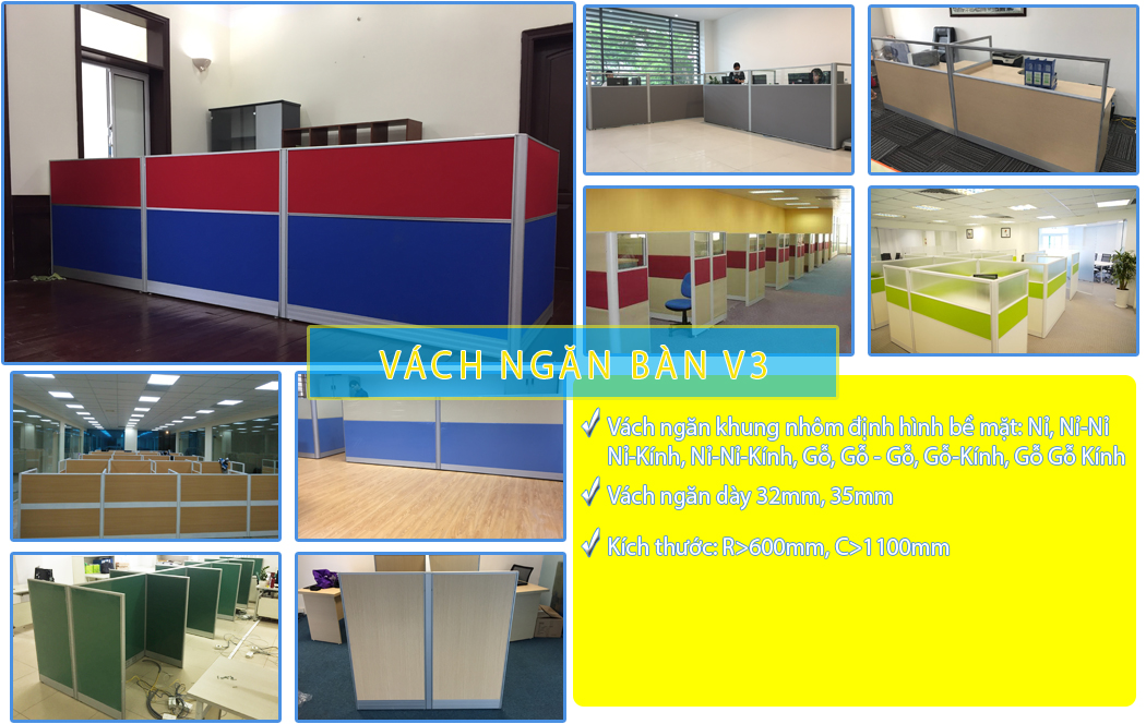 Mẫu vách ngăn bàn làm việc V3 là một nhóm sản phẩm vách ngăn bàn làm việc khung nhôm định hình, Vách được làm bằng khung nhôm định hình bề mặt bằng Nỉ, Gỗ hoặc các tầng Nỉ hoặc các tầng gỗ xen kẽ có thể khác nhầu nhau được chia cắt bằng chỉ nhôm. Một số trường hợp còn kết hợp thêm kính trắng hoặc kính lụa trên vách ngăn. Độ dày của vách V3 là 32mm hoặc 35mm theo độ dày của khung nhôm định hình, với mỗi một hệ dầy khác nhau thì khuân nhôm định hình có thể khác nhau đôi chút