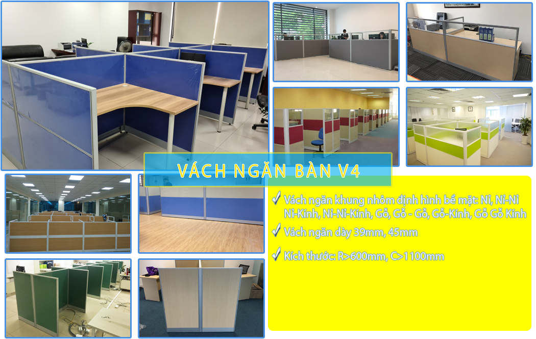 Mẫu vách ngăn bàn làm việc V4 là một nhóm sản phẩm vách ngăn bàn làm việc khung nhôm định hình, Vách được làm bằng khung nhôm định hình bề mặt bằng Nỉ, Gỗ hoặc các tầng Nỉ hoặc các tầng gỗ xen kẽ có thể khác nhầu nhau được chia cắt bằng chỉ nhôm. Một số trường hợp còn kết hợp thêm kính trắng hoặc kính lụa trên vách ngăn. Độ dày của vách V4 là 39mm hoặc 45mm theo độ dày của khung nhôm định hình, với mỗi một hệ dầy khác nhau thì khuân nhôm định hình có thể khác nhau đôi chút