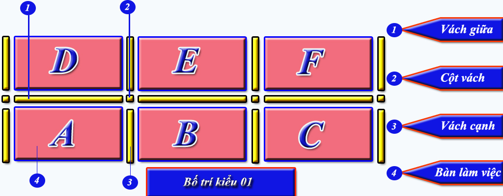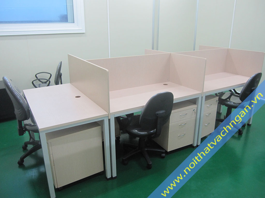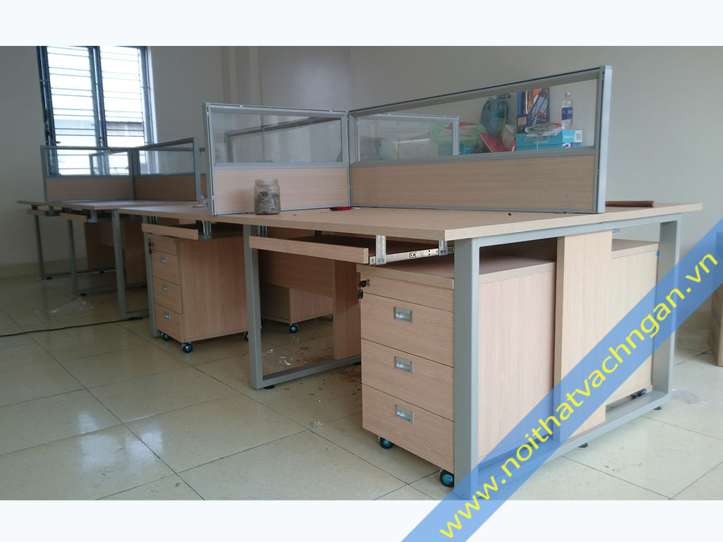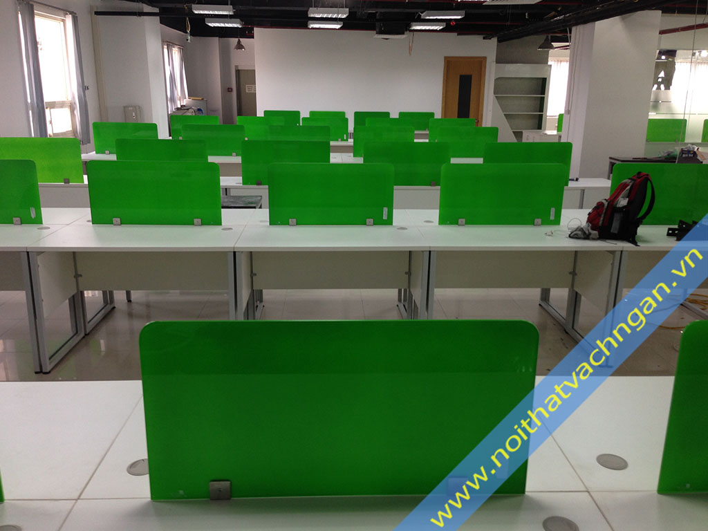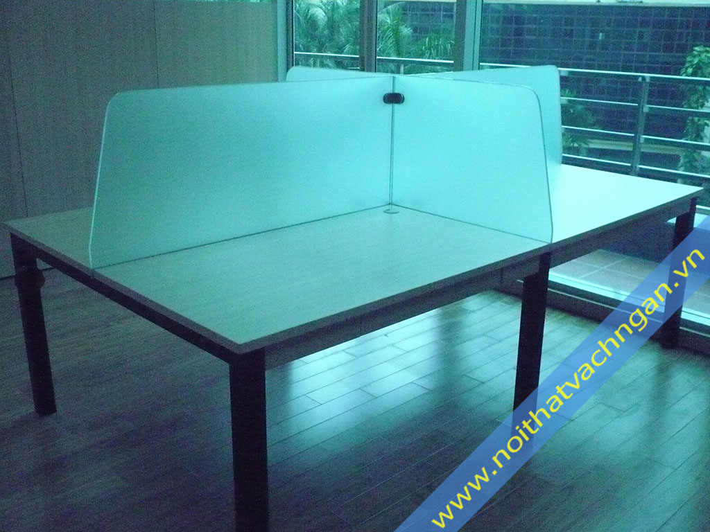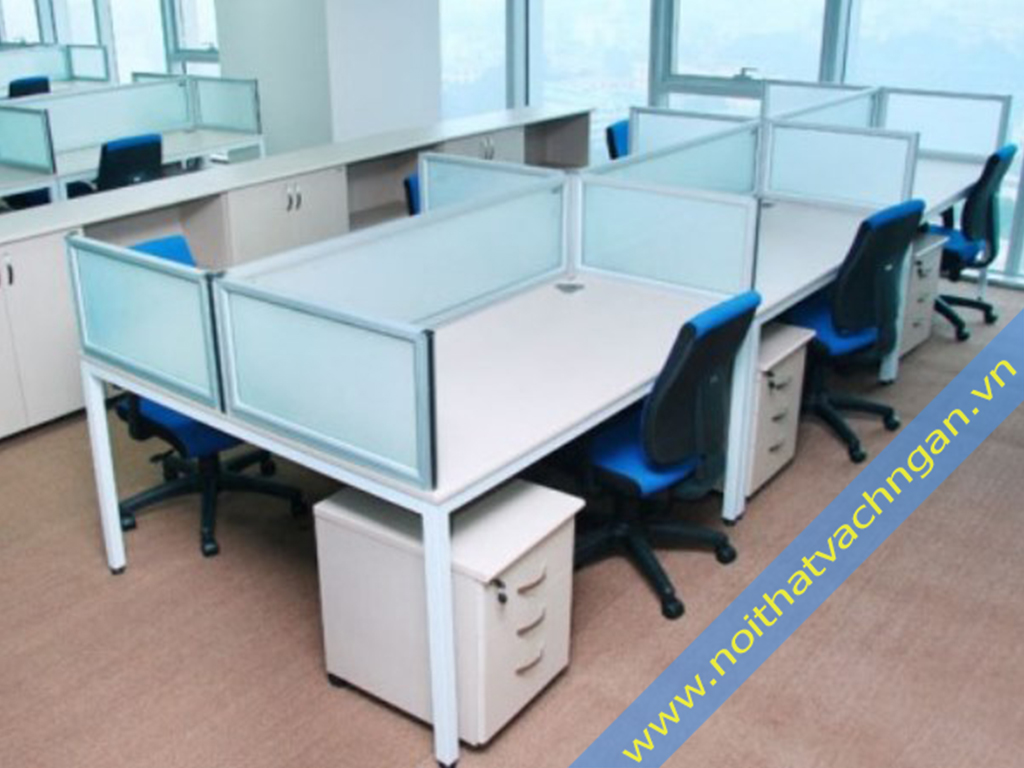 + Vách ngăn mặt bàn làm việc có khung nhôm định hình quây quanh, bề mặt có thể bằng gỗ công nghiệp phủ melamine toàn bộ, Nỉ, Kính hoặc là sự kết hợp Gỗ - Nỉ - Kính có ngăn cách nhau bởi chỉ nhôm