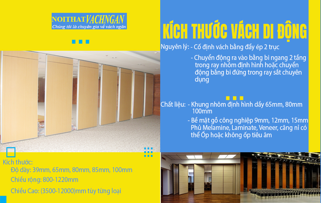 | 10 | VND65M9 | Vách ngăn di động VND65M9 mặt gỗ MFC là một sản phẩm Vách ngăn di động dầy 65mm do chúng tôi cung cấp. Chất liệu được làm bằng khung nhôm định hình bề mặt nhôm anode trắng mờ, khung trong bằng thép mạ kẽm. Mặt vách được làm bằng gỗ công nghiệp ván ép dầy 9mm bề mặt phủ melamine cao cấp. Bên trong có bông thủy tinh cách âm. Vách ngăn hoạt động theo nguyên lý cố định vách bằng đẩy ép 2 trục, chuyển động ra vào bằng bi ngang 2 tầng trong ray nhôm định hình. Vách ngăn di động không chia chỉ nhôm chia trên vách, không có cửa trên vách ngăn và không xen kẽ mầu giữa các tấm vách | ![]() |