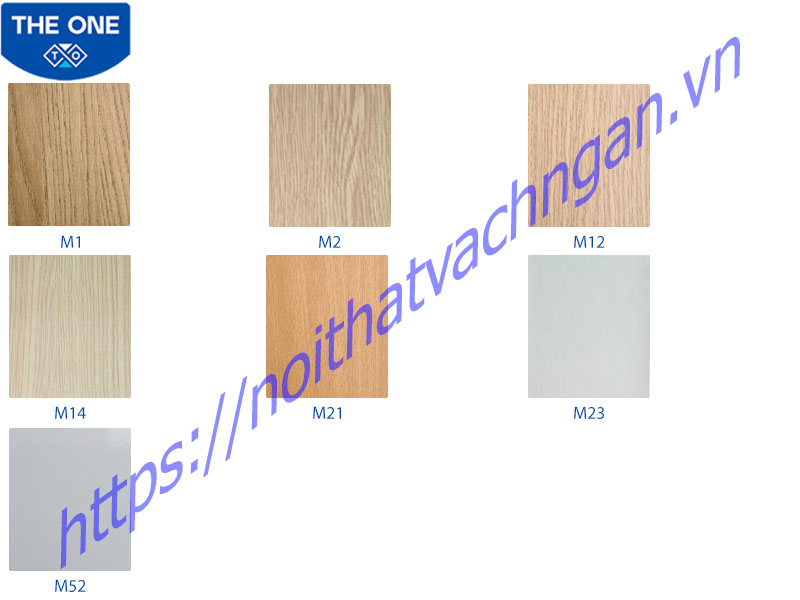 Bảng mẫu mầu gỗ vách ngăn Nội Thất The One - Hòa Phát sử dụng các mầu tiêu chuẩn: M1, M2, M12, M14, M21, M23, M52 đối với các vách ngăn có mã sản phẩm Vách ngăn VN03, Vách ngăn VN04 và Vách ngăn VN05 và Mầu M21, M23 với sản phẩm vách ngăn VN01: