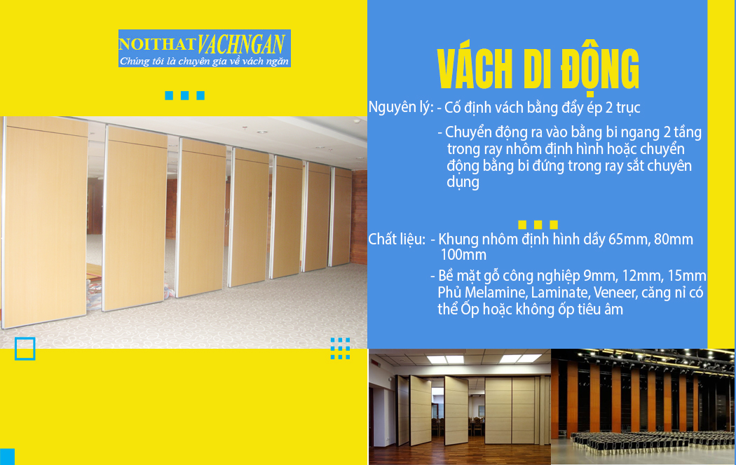 Mẫu vách ngăn di động dày 65mm là vách ngăn di động khung nhôm định hình, vách di động dày 65mm, chiều rộng (900-1220)mm và chiều cao tối đa nhỏ hơn 4000mm.Bề mặt có gỗ công nghiệp dầy 9mm có thể phủ Veneer, Melamine, Laminate, Căng Nỉ. Vách ngăn di động có bông thủy tinh cách âm ở giữa. Nguyên lý hoạt động của vách ngăn di động dầy 65mm là: Cố định vách bằng đẩy ép 2 trục, chuyển động ra vào bằng bi ngang 2 tầng treo trên ray nhôm định hình