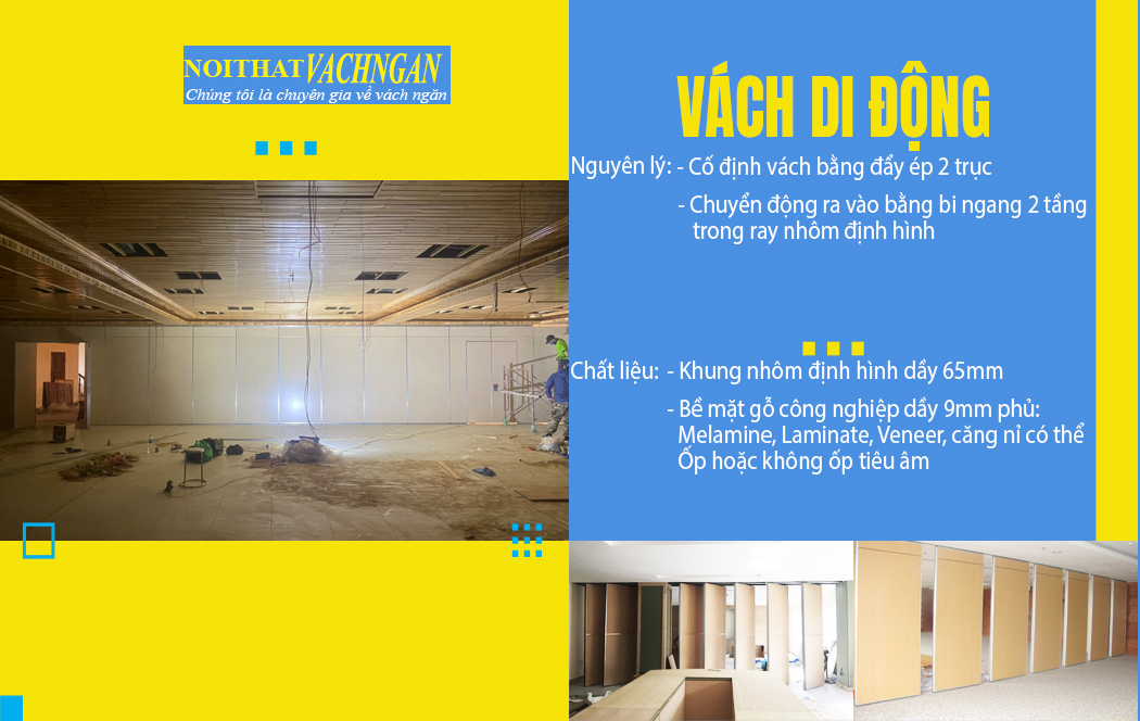 Mẫu vách ngăn di động dầy 65mm là một nhóm sản phẩm vách ngăn di động do công ty sản xuất, cung cấp trên thị trường. Vách ngăn di động có khung trong làm bằng sắt mạ kẽm, khung ngoài bằng nhôm có bề mặt Anode mầu trắng mờ. Bên trong vách ngăn có bông thủy tinh cách âm. Vách ngăn di động dầy 65mm vận hành theo nguyên lý cố định vách ngăn bằng ép đẩy hai trục, Chuyển động ra vào bằng tấm bi ngang 2 tầng trong ray nhôm định hình