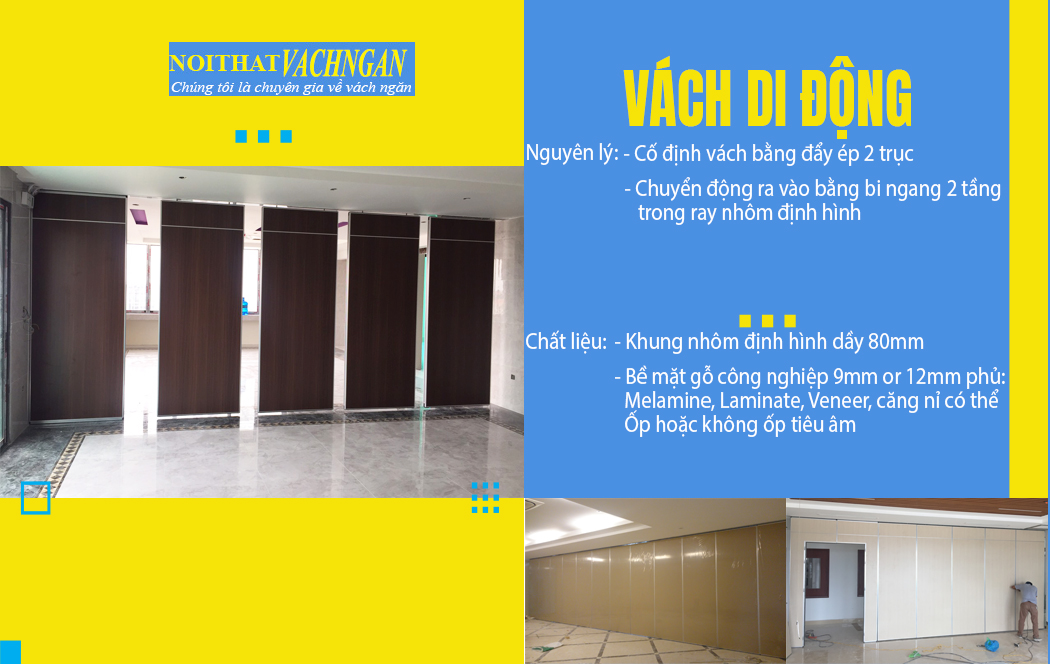Mẫu vách ngăn di động dầy 80mm là một nhóm sản phẩm vách ngăn di động do công ty sản xuất, cung cấp trên thị trường. Vách ngăn di động có khung trong làm bằng sắt mạ kẽm, khung ngoài bằng nhôm có bề mặt Anode mầu trắng mờ. Bên trong vách ngăn có bông thủy tinh cách âm. Vách ngăn di động dầy 80mm vận hành theo nguyên lý cố định vách ngăn bằng ép đẩy hai trục, Chuyển động ra vào bằng tấm bi ngang 2 tầng trong ray nhôm định hình
