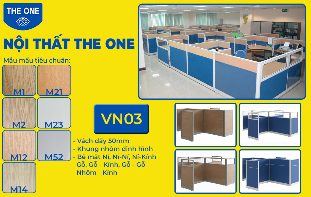 Chất liệu vách ngăn VN03 nội thất the one được làm bằng khung nhôm định hình bo quanh, bề mặt vách ngăn được làm toàn bộ bằng gỗ, hoặc toàn bộ bằng nỉ hoặc kết hợp Gỗ-Gỗ, Gỗ - Kính, Gỗ - Gỗ - Kính hoặc kết hợp Nỉ- Nỉ, Nỉ - Nỉ - Kính hoặc Nỉ - Kính, nhôm kính. Nếu vách ngăn kết hợp thì sẽ có 1 chỉ nhôm ngăn cách giữa các phần của vách ngăn.