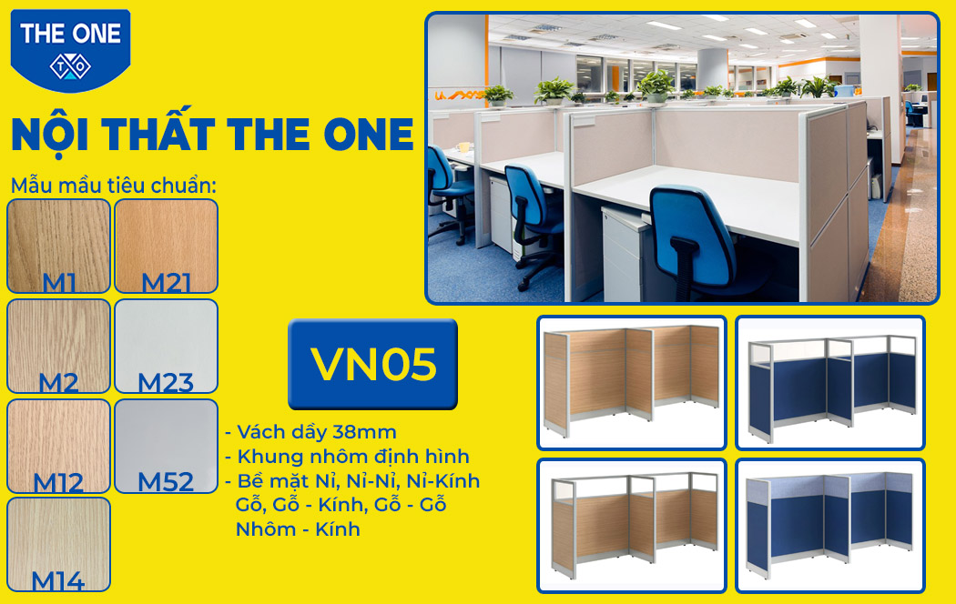 Chất liệu vách ngăn VN05 nội thất the one được làm bằng khung nhôm định hình bo quanh, bề mặt vách ngăn được làm toàn bộ bằng gỗ, hoặc toàn bộ bằng nỉ hoặc kết hợp Gỗ-Gỗ, Gỗ - Kính, Gỗ - Gỗ - Kính hoặc kết hợp Nỉ- Nỉ, Nỉ - Nỉ - Kính hoặc Nỉ - Kính, nhôm kính. Nếu vách ngăn kết hợp thì sẽ có 1 chỉ nhôm ngăn cách giữa các phần của vách ngăn.
