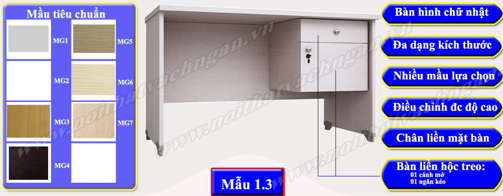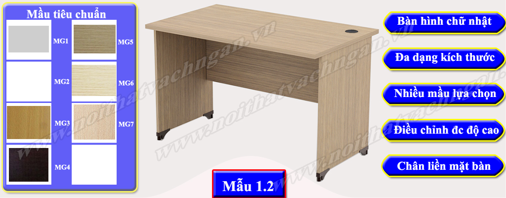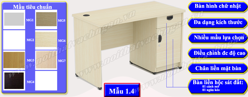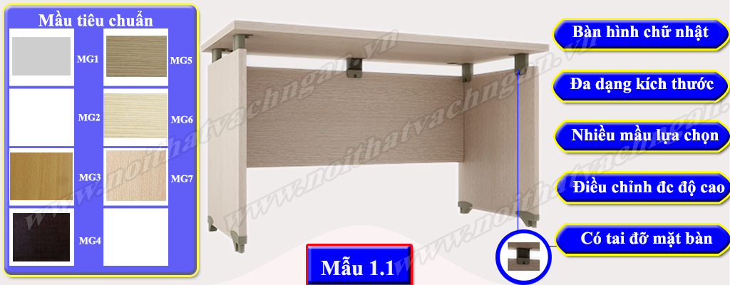 - Hiện tại chúng tôi đang sử dụng 08 mầu mầu gỗ tiêu chuẩn cho sản phẩm bao gồm MG1, MG2, MG3, MG4, MG5, MG6, MG7 & MG8. Trong một số trường hợp nếu bạn có nhu cầu về mầu khác bạn tham khảo mẫu mầu gỗ bàn làm việc có vách ngăn của chúng tôi hoặc có thể gửi trực tiếp mầu gỗ bạn mong muốn cho chúng tôi để được tư vấn tốt nhất.