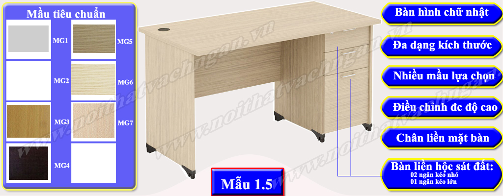 Mẫu 1.5: Bàn hình chữ nhật chân gỗ. Chân và mặt bàn liên kết với nhau bằng ke và cam. Sản phẩm có 1 hộc liền với chân bàn và sát đất, Hộc có 3 ngăn kéo trong đó 2 ngăn kéo nhỏ và 1 ngăn kéo lơn, không có khay bàn phím, không có giá để CPU. Sản phẩm thông dụng được làm bằng gỗ công nghiệp phủ melamine hoặc laminate ngoài ra cá biệt có thể làm bằng gỗ tự nhiên, gỗ công nghiệp bề mặt phủ chất liệu khác trên thị trường