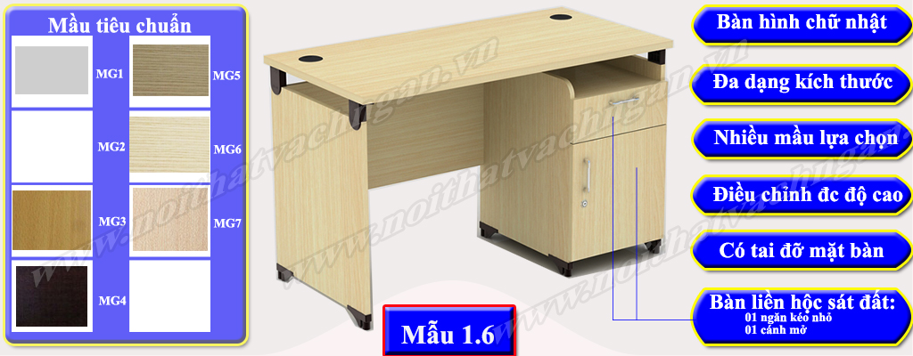 Mẫu 1.6: Bàn hình chữ nhật chân gỗ. Chân và mặt bàn liên kết với nhau bằng tai đỡ. Sản phẩm có 1 hộc liền với chân bàn và sát đất, hộc có 1 ngăn kéo và 1 cánh mở, không có khay bàn phím, không có giá để CPU. Sản phẩm thông dụng được làm bằng gỗ công nghiệp phủ melamine hoặc laminate ngoài ra cá biệt có thể làm bằng gỗ tự nhiên, gỗ công nghiệp bề mặt phủ chất liệu khác trên thị trường