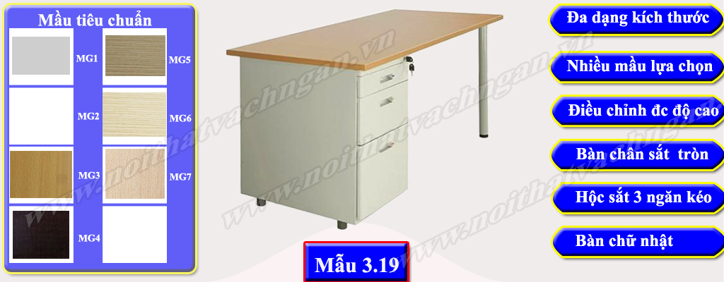 Mẫu 3.19 Bàn làm việc gỗ công nghiệp bề mặt phủ melamine hoặc laminate, chân bàn ống trụ tròn được liên kết trực tiếp với bàn thông qua các vít, giữa các chân không có giằng liên kết. Một bên bàn có hộc liền 3 ngăn kéo riêng biệt được sử dụng đi kèm có chiều cao tới mặt bàn được sử dụng đi kèm thay thế chân bàn. Hộc này thường được làm bằng gỗ công nghiệp giống mặt bàn đôi khi được làm bằng sắt sơn tĩnh điện mầu giống chân bàn.
