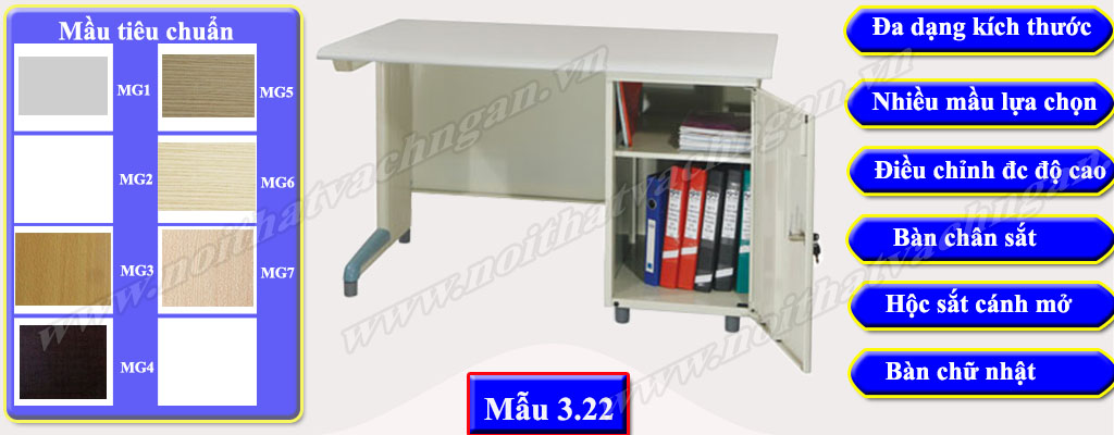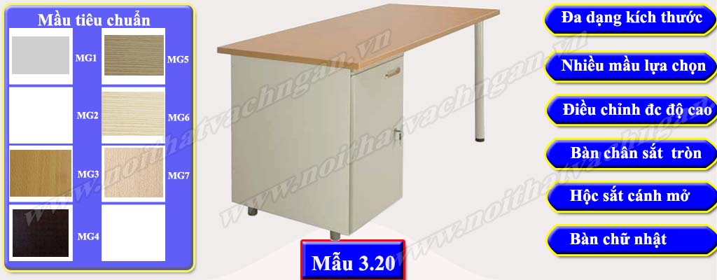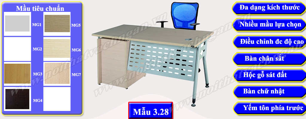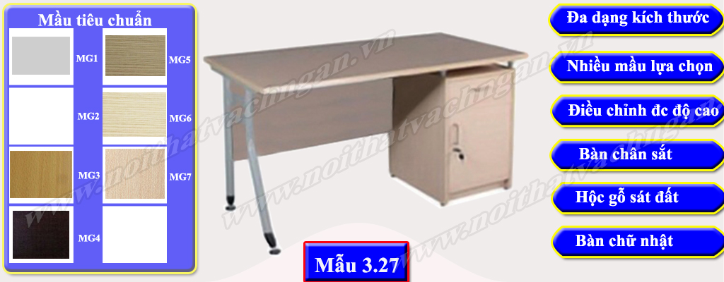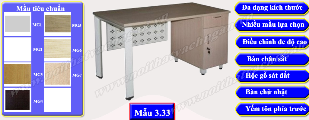 - Hiện tại chúng tôi đang sử dụng 08 mầu mầu gỗ tiêu chuẩn cho bàn làm việc chân sắt hình chữ nhật bao gồm MG1, MG2, MG3, MG4, MG5, MG6, MG7 & MG8 để phục vụ nhu cầu sử dụng của bạn. Trong một số trường hợp nếu bạn có nhu cầu về mầu khác bạn tham khảo mẫu mầu gỗ bàn làm việc có vách ngăn của chúng tôi hoặc có thể gửi trực tiếp mầu gỗ bạn mong muốn cho chúng tôi để được tư vấn tốt nhất.