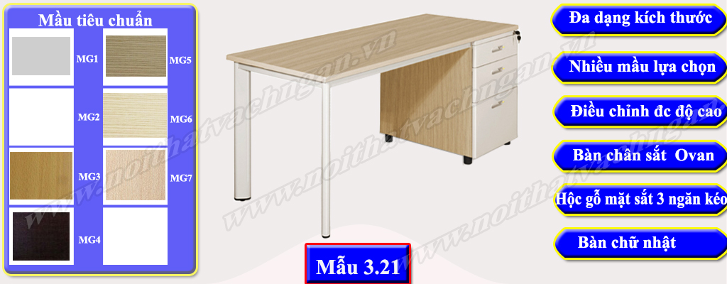 Mẫu 3.21 Bàn làm việc gỗ công nghiệp bề mặt phủ melamine hoặc laminate, chân bàn ống trụ Ovan được liên kết trực tiếp với bàn thông qua các vít, giữa các chân có giằng liên kết. Một bên bàn có hộc liền 3 ngăn kéo riêng biệt được sử dụng đi kèm có chiều cao tới mặt bàn được sử dụng đi kèm thay thế chân bàn. Hộc này thường được làm bằng gỗ công nghiệp giống mặt bàn hoặc làm bằng sắt sơn tĩnh điện mầu giống chân bàn