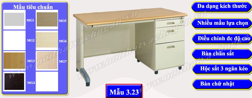 Mẫu 3.23 Bàn làm việc gỗ công nghiệp bề mặt phủ melamine hoặc laminate, chân bàn sắt kiểu chân hình chữ U được liên kết trực tiếp với bàn thông qua các vít, phía trước có yếm liền bàn. Một bên bàn có hộc liền 3 ngăn kéo riêng biệt cao tới mặt bàn.