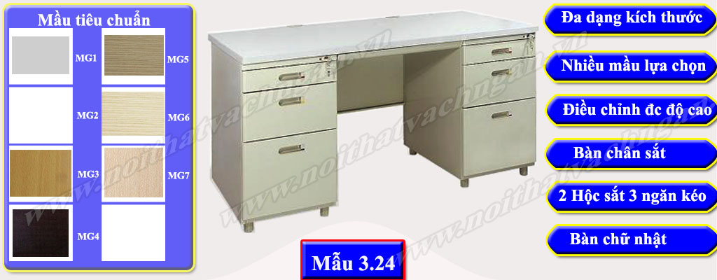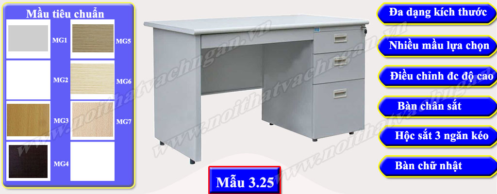 Mẫu 3.25 Bàn làm việc gỗ công nghiệp bề mặt phủ melamine hoặc laminate, chân bàn sắt sơn tĩnh điện mầu ghi, một bên bàn là hộc liền 3 ngăn kéo hộc sát đất và cao tới mặt bàn.