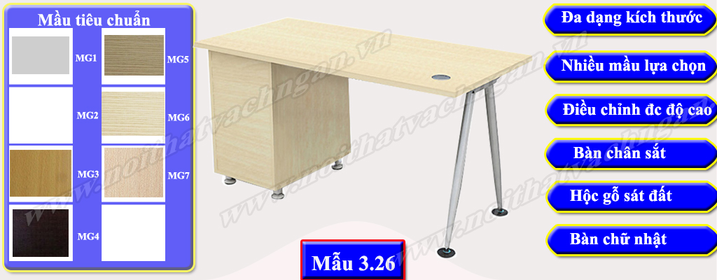 Mẫu 3.26 Bàn làm việc gỗ công nghiệp bề mặt phủ melamine hoặc laminate, chân bàn sắt kiểu chân hình chữ A được liên kết trực tiếp với bàn thông qua các vít, phía trước không có yếm liền bàn. Một bên bàn có hộc liền bàn.
