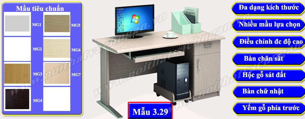 Mẫu 3.29 Bàn làm việc gỗ công nghiệp bề mặt phủ melamine hoặc laminate, chân bàn sắt kiểu chân hình chữ U, phía trước có yếm gỗ liền bàn. Một bên bàn có hộc 1 cánh mở và một ngăn kéo, hộc bàn sát đất, bàn làm việc có khay bàn phím và giá để CPU