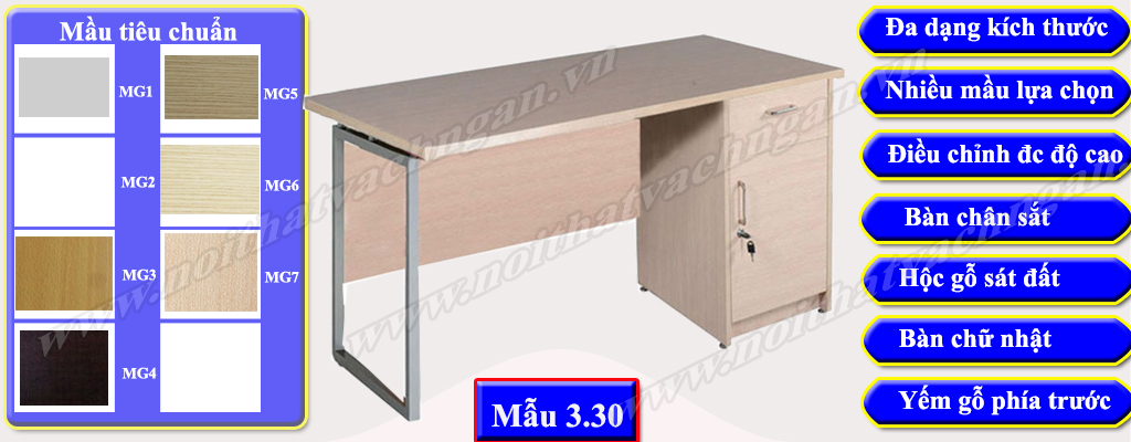 Mẫu 3.30 Bàn làm việc gỗ công nghiệp bề mặt phủ melamine hoặc laminate, chân bàn sắt hộp vuông được liên kết trực tiếp với bàn thông qua các vít, phía trước có yếm gỗ liền bàn. Một bên bàn có hộc liền bàn 1 cánh mở và 1 ngăn kéo