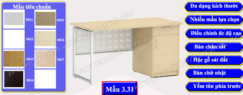 Mẫu 3.31 Bàn làm việc gỗ công nghiệp bề mặt phủ melamine hoặc laminate, chân bàn sắt hộp vuông được liên kết trực tiếp với bàn thông qua các vít, phía trước có yếm sắt liền bàn. Một bên bàn có hộc liền bàn 1 cánh mở và 1 ngăn kéo