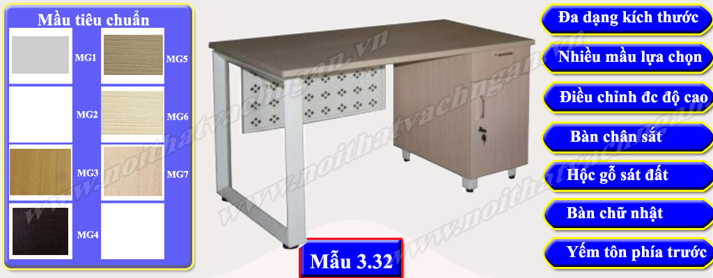 Mẫu 3.32 Bàn làm việc gỗ công nghiệp bề mặt phủ melamine hoặc laminate, chân bàn sắt hình chữ nhật ống hình tam giác được liên kết trực tiếp với bàn thông qua các vít, phía trước có yếm sắt liền bàn. Một bên bàn có hộc liền bàn 1 cánh mở và 1 ngăn kéo.