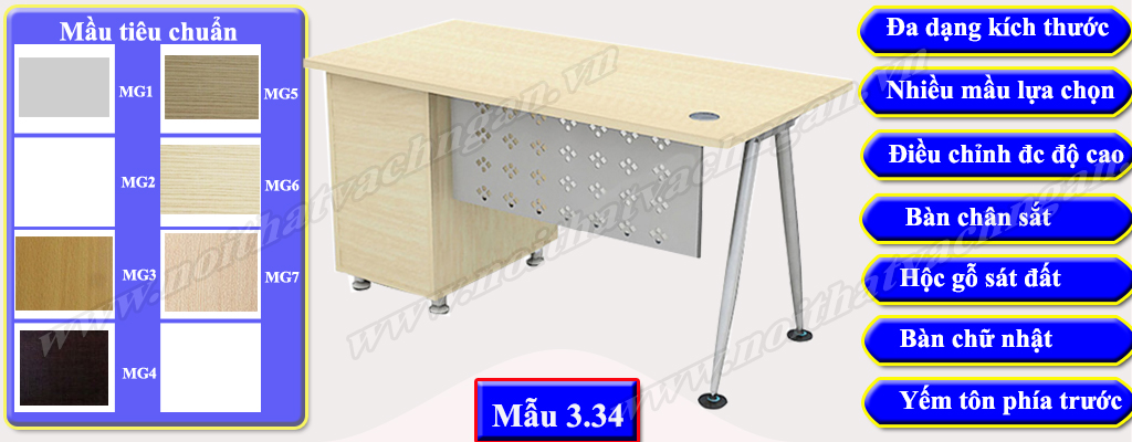 Mẫu 3.34 Bàn làm việc gỗ công nghiệp bề mặt phủ melamine hoặc laminate, chân bàn sắt hình tròn tóp đầu, chân bàn kiểu chữ A được liên kết trực tiếp với bàn thông qua các vít, phía trước có yếm sắt liền bàn. Một bên bàn có hộc liền bàn