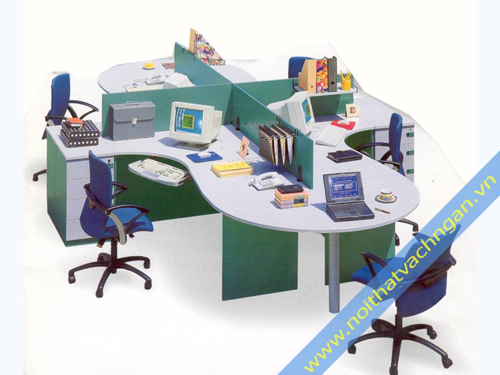 - Vách ngăn được lắp ghép bởi các bàn chữ nhật người ngồi đối diện nhau, toàn bộ vách trên mặt bàn.