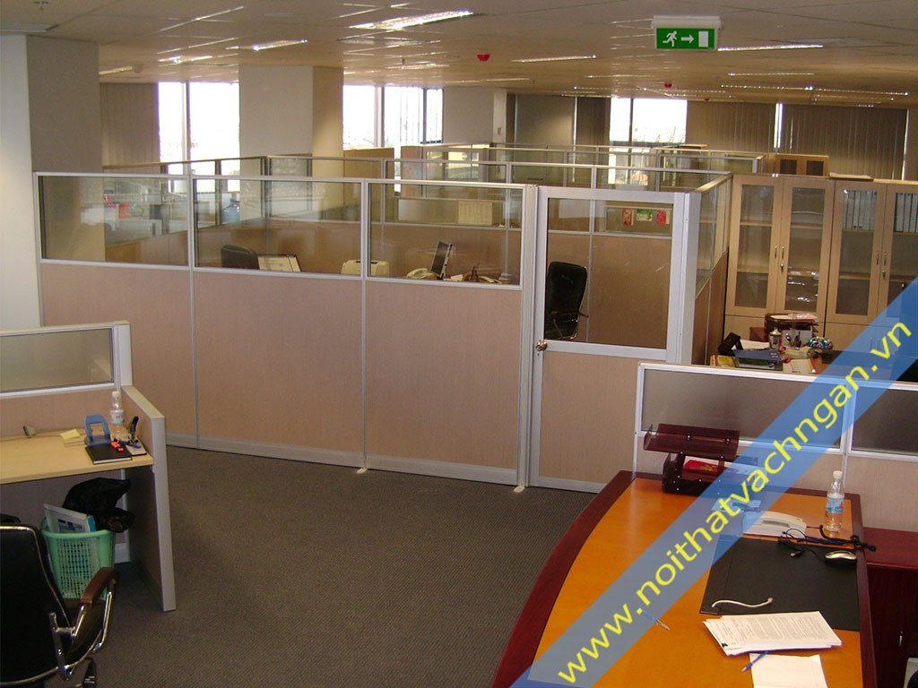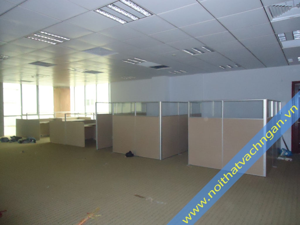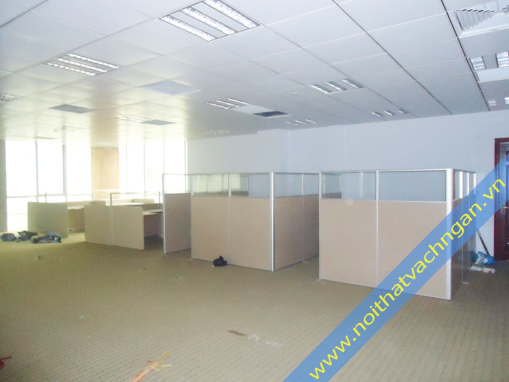 - Chất liệu: Khung nhôm định hình bề mặt phun cát ánh kim, vách trên kính 1 mặt 4mm, vách dưới gỗ, vách không có hộp kỹ thuật đi dây điện.