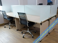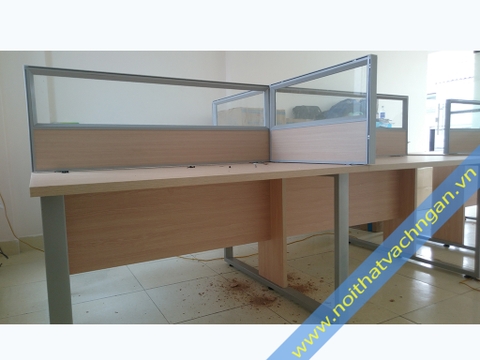 Ngoài chi phí về vách ngăn bàn làm việc, một chi phí khác đó là bàn làm việc, hộc, tủ phụ,... để phục vụ cho nhân viên. Hiện nay, trên thị trường nội thất có rất nhiều mẫu bàn làm việc đi kèm với vách ngăn, mỗi một mẫu bàn có giá cả khác nhau phụ thuộc vào: Kiểu dáng, kích thước, chất liệu, hiện tại chúng tôi tạm thời chia ra làm các loại mẫu bàn làm việc đi kèm với vách ngăn bao gồm: Bàn làm việc có mặt bàn chữ nhật, Bàn làm việc có mặt bàn là lượn trái, lượn phải, Bàn làm việc có mặt bàn hình tam giác, chữ Z, ..., sản phẩm có thể là chân gỗ, chân sắt, không có chân (Bắn trực tiếp lên vách ngăn), bàn có thể liền hộc khoặc không liền hộc. Với sản phẩm vách ngăn bàn làm việc Gỗ Kính VMB3G1K khung nhôm định hình bề mặt Gỗ Kính thì phù hợp với tất cả các loại bàn và mẫu bàn trên.